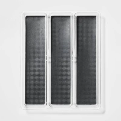 Prevent clutter in your kitchen drawers with the Acrylic Drawer Multi-Compartment Bin from Brightroom™. This plastic drawer organizer is separated into three sections that provide a designated spot for spoons, forks and knives or other kitchen tools so they don’t get piled up in the drawer. A protective liner helps keep the organizer from getting scratched by utensils, and slip-resistant feet keep it in place as you rummage around. With a clear construction and black liner, the multi-compartment drawer organizer easily coordinates with any kitchen color or decor style.
