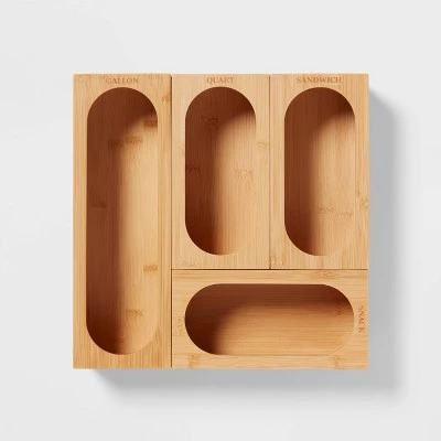 Easily access different food storage bags whenever needed with this Bamboo Plastic Food Storage Bag Organizer from Brightroomâ„¢. This bamboo organizer is designed with four oblong-shaped slots to stash different size food storage bags. Featuring a natural wood finish, it showcases embossed “Gallon,” “Quart,” “Sandwich” and “Snack” above each slot for easy identification. Compact in size and featuring a freestanding design, it easily fits inside a kitchen drawer or shelf for effective space utilization.