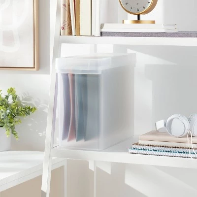 An excellent addition to your home office, this Plastic Hanging File Crate with Lid from Brightroom™ will help keep your workspace clutter-free and organized. This vertical hanging file crate features a large compartment to store all your files, folders and documents in one place, while a removable lid helps keep the papers dust-free and protected. Place it on a shelf, desktop or console table for a versatile storage option you’ll love to display.
